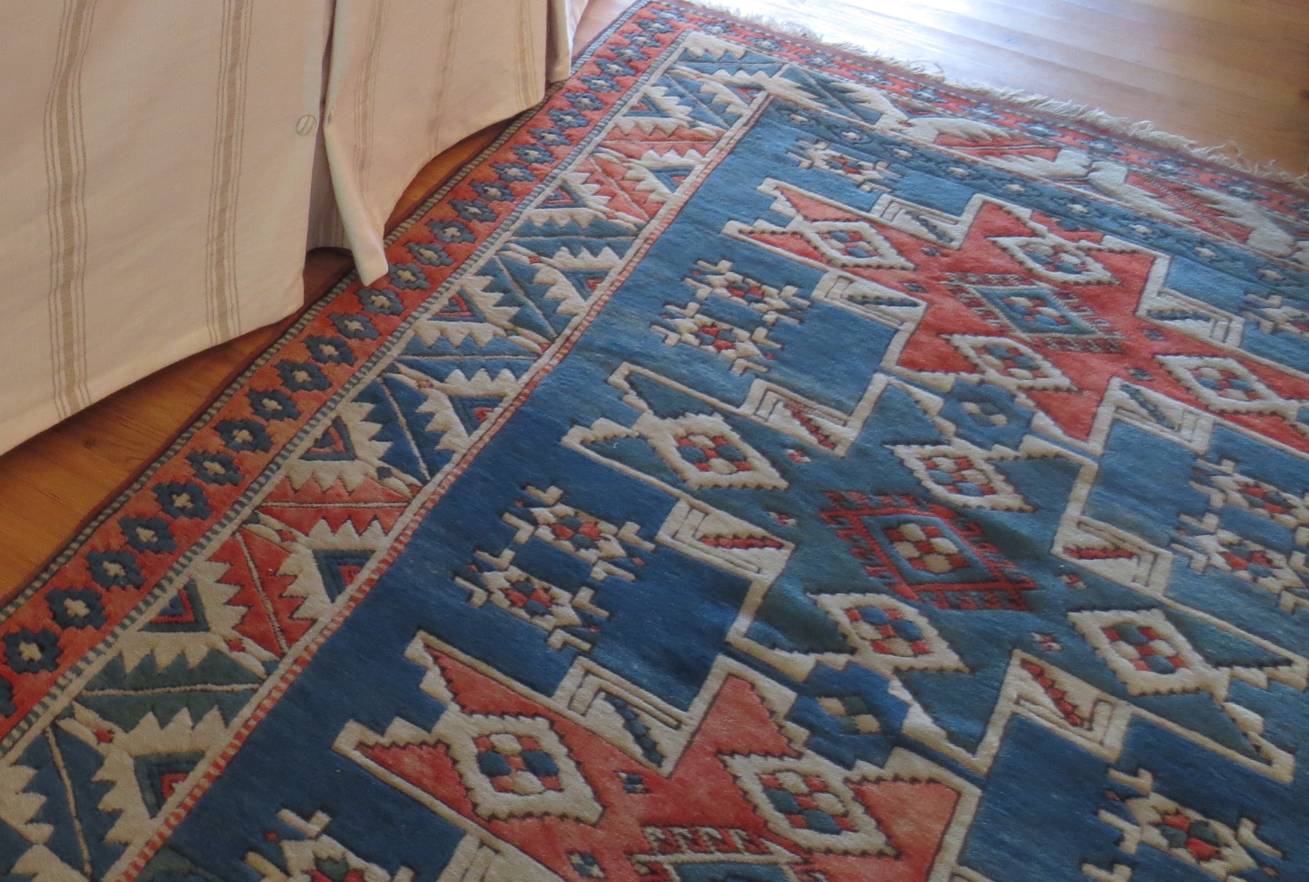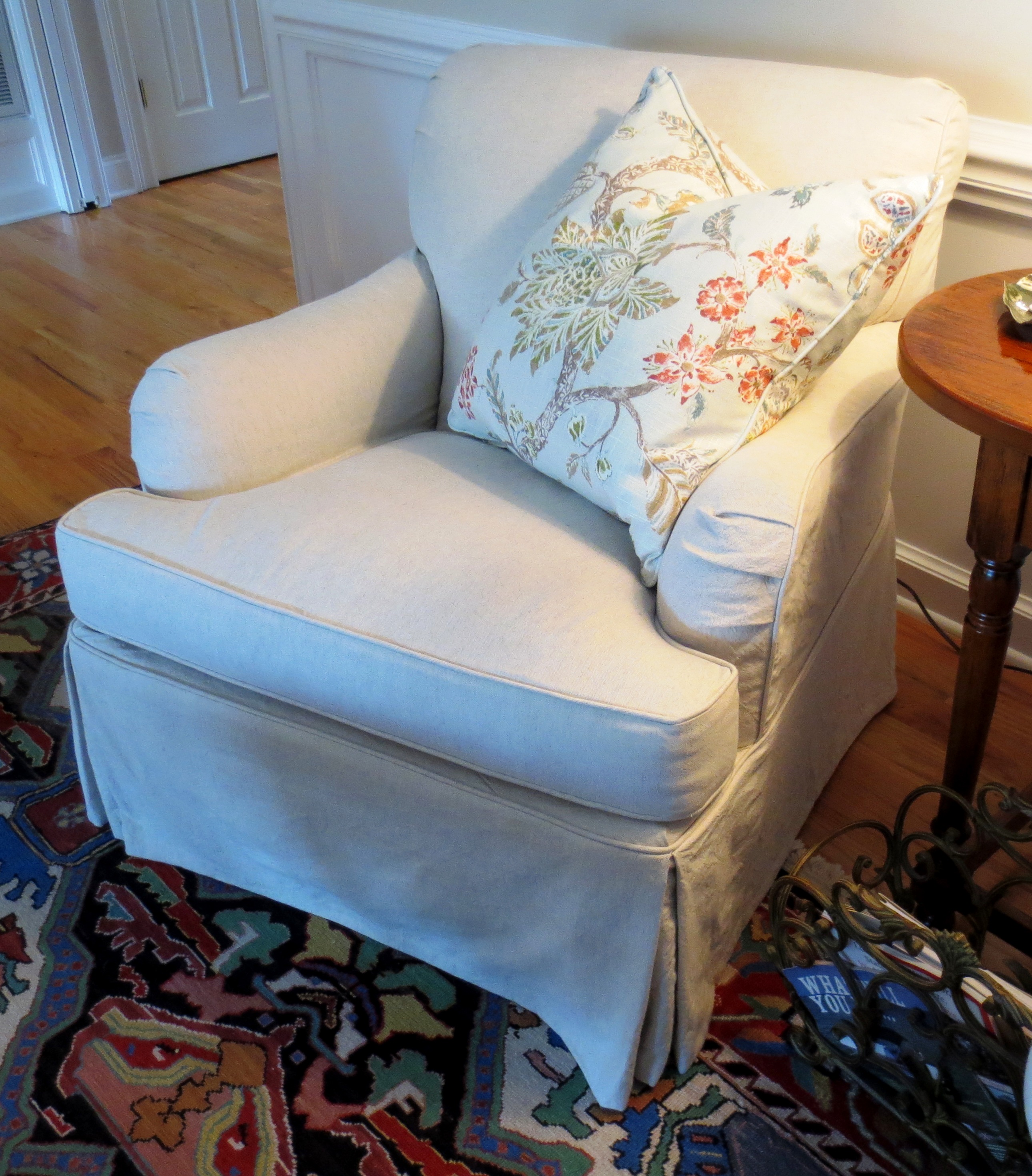 The patterned club chair was slipcovered in washed linen, which calmed the space down and let the patterned rugs stand out.