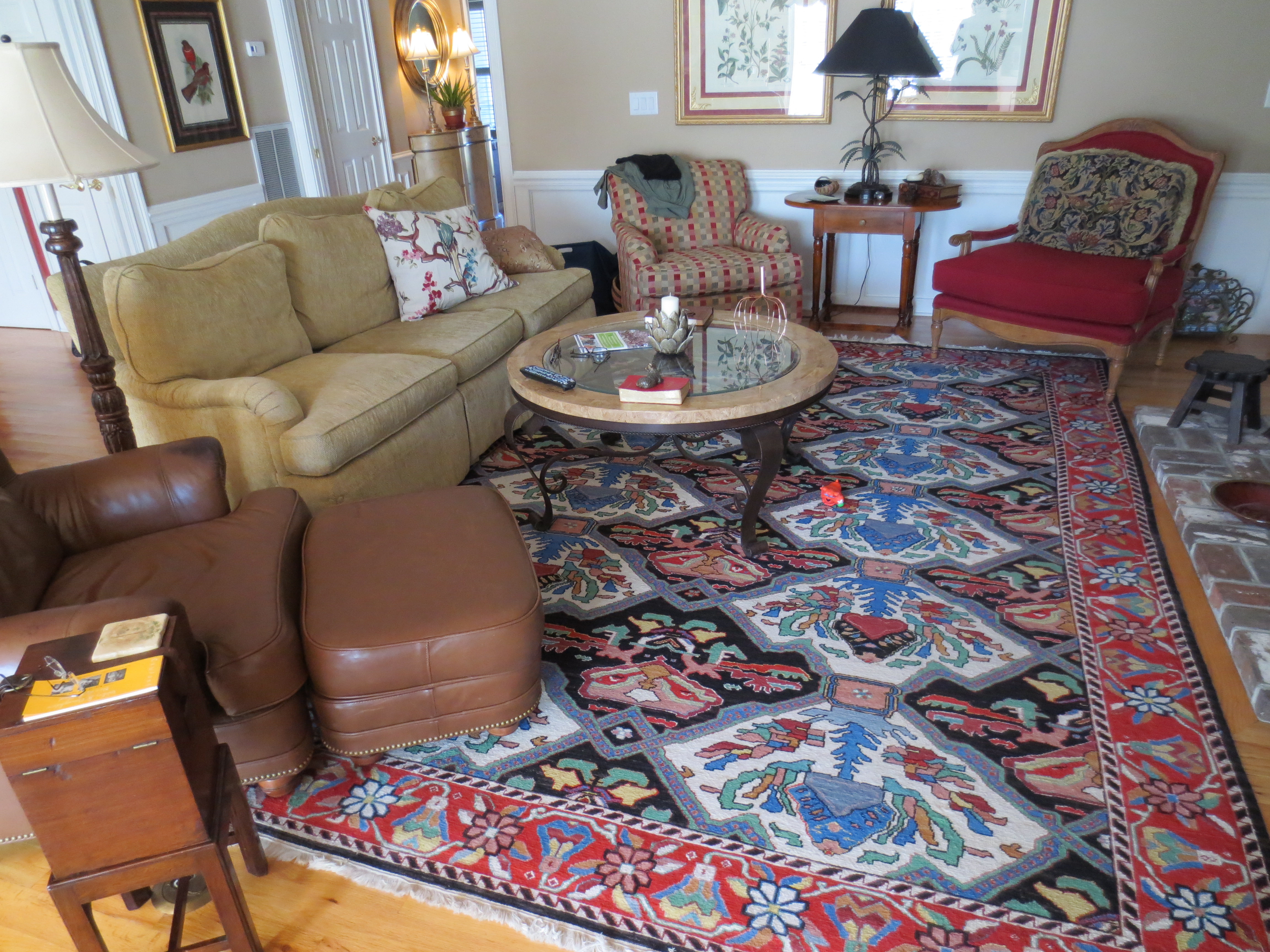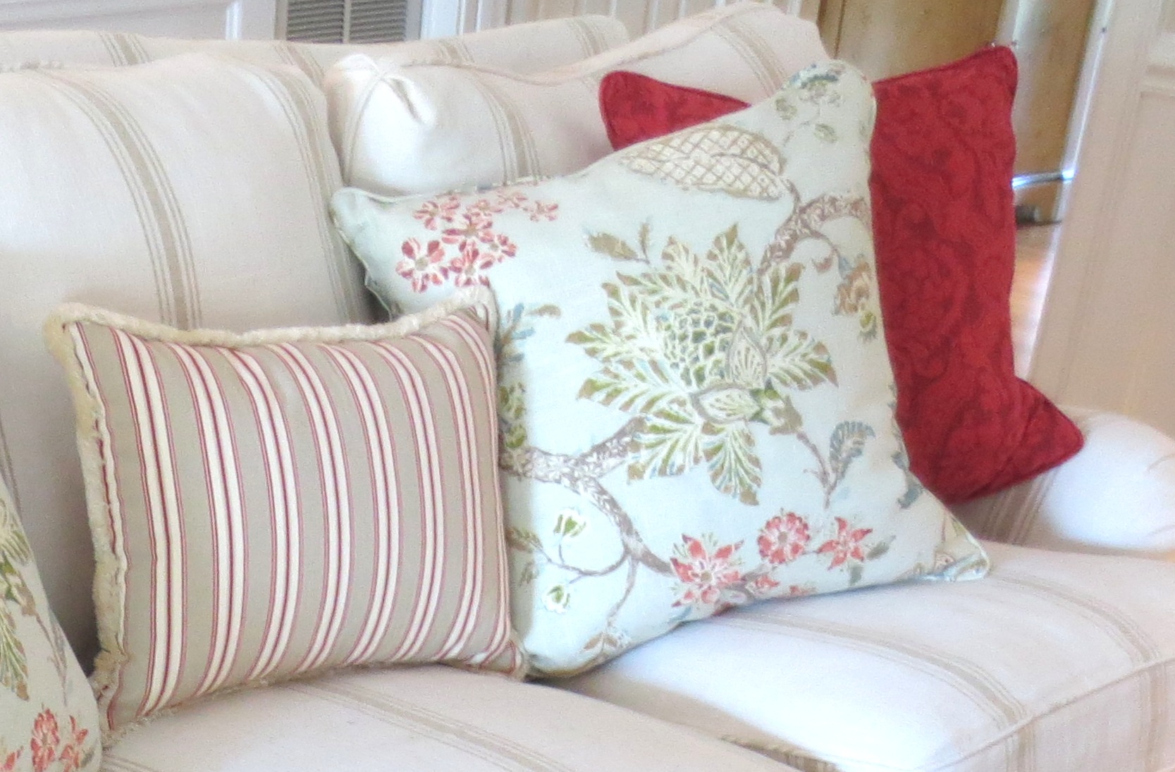 Finally, we brought a bunch of pillows over to play around with until we found just the right combination. We wanted to pick up the colors of the rug without being too matchy or too busy. Two red linen pillows with a damask print were perfect. We tried several other pillows with them, and unanimously settled on the faded Tree-of-Life floral print. The pale aqua background provided the soft look the client wanted. A khaki and red simple ticking stripe and a blue mini-trellis pattern for the Bergere were the finishing touches.
