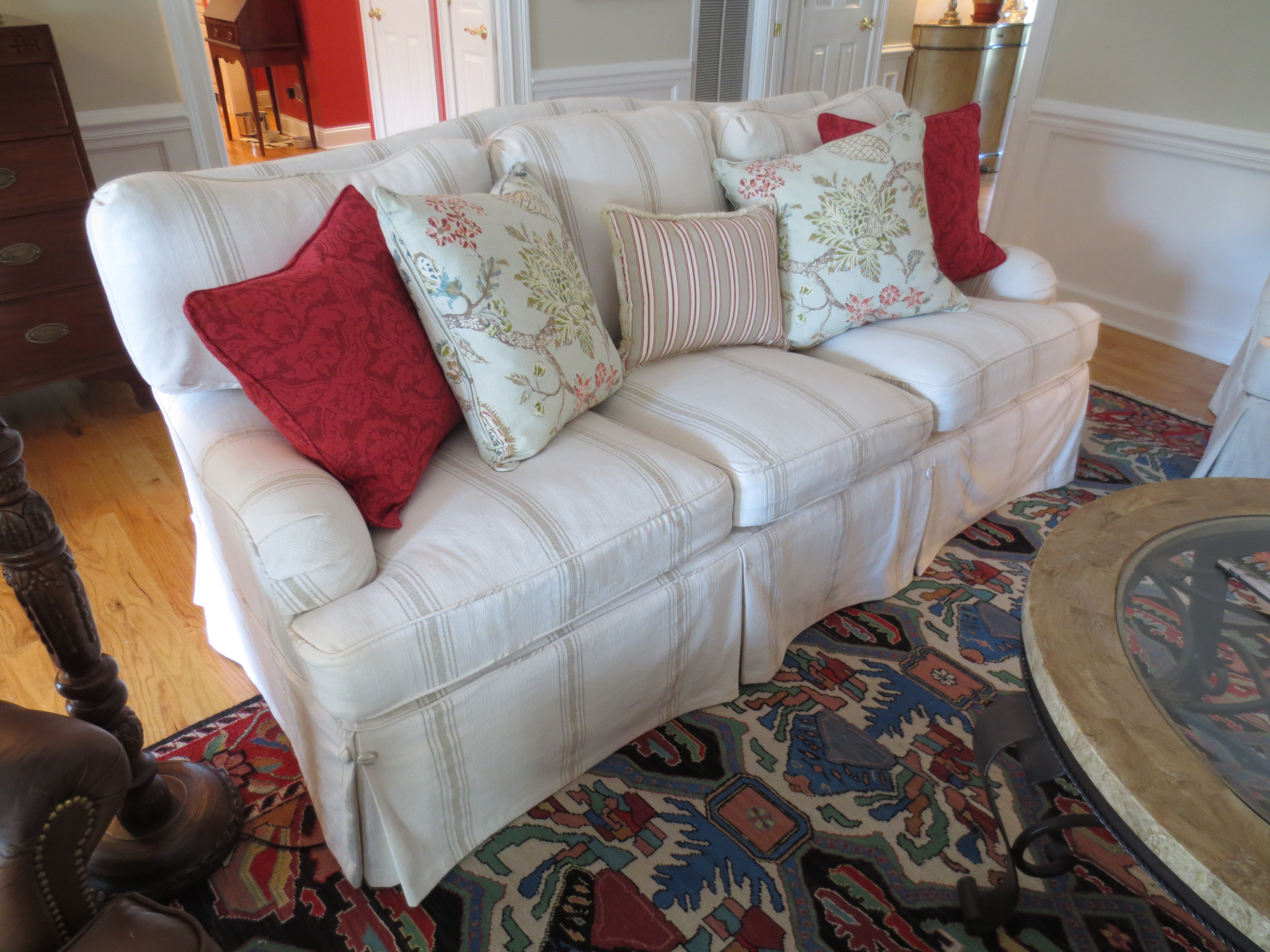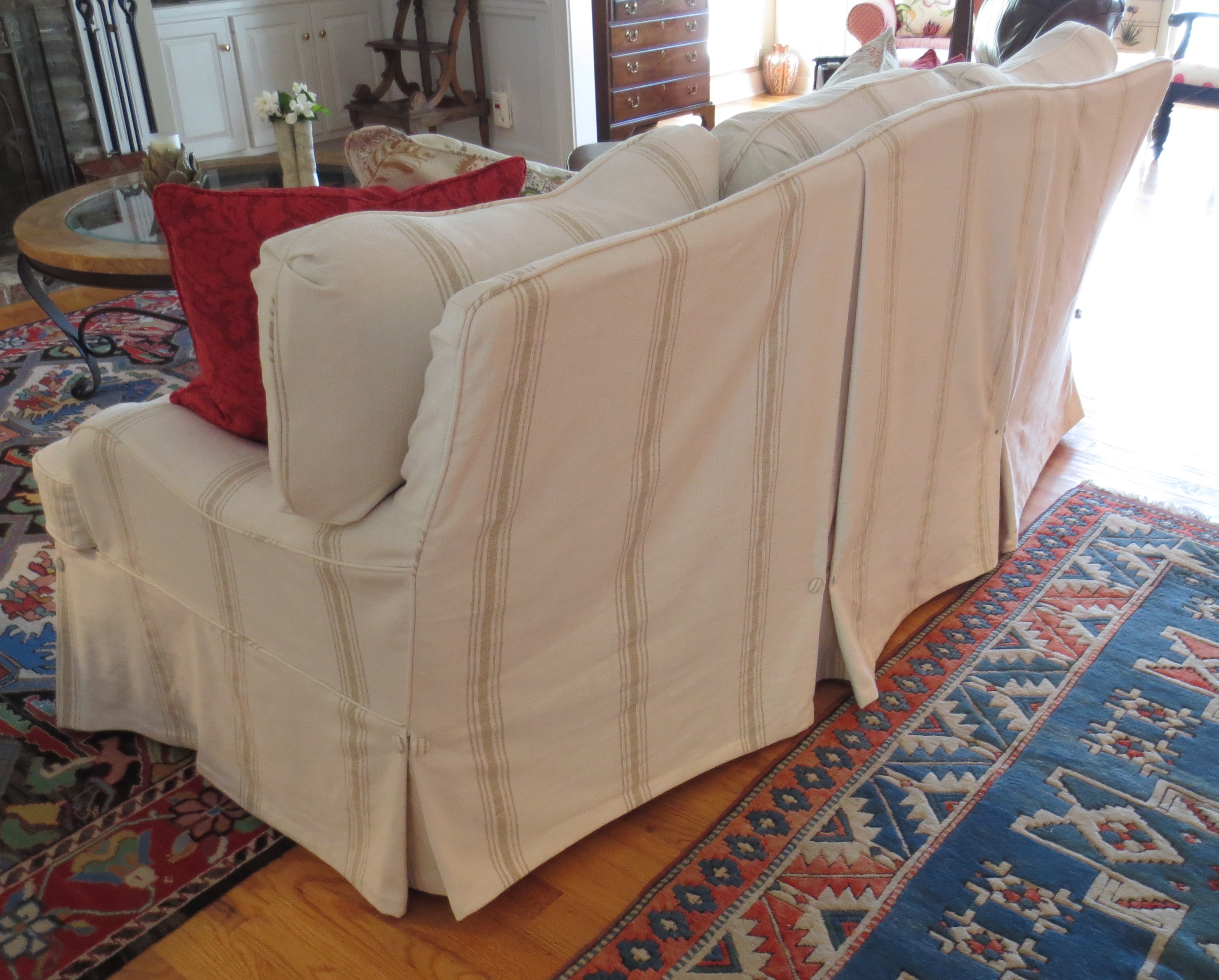 The fabric we chose for the sofa slipcover is nubby ivory cotton with woven flax-colored stripes in the style of traditional French textiles.